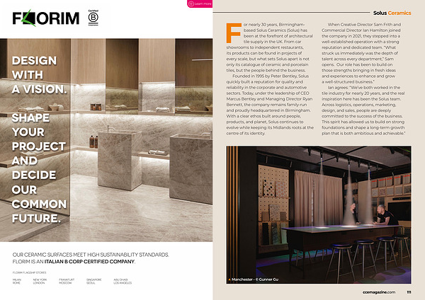 For nearly 30 years, Birminghambased Solus Ceramics( Solus) has been at the forefront of architectural tile supply in the UK. From car showrooms to independent restaurants, its products can be found in projects of every scale, but what sets Solus apart is not only its catalogue of ceramic and porcelain tiles, but the people behind the business.