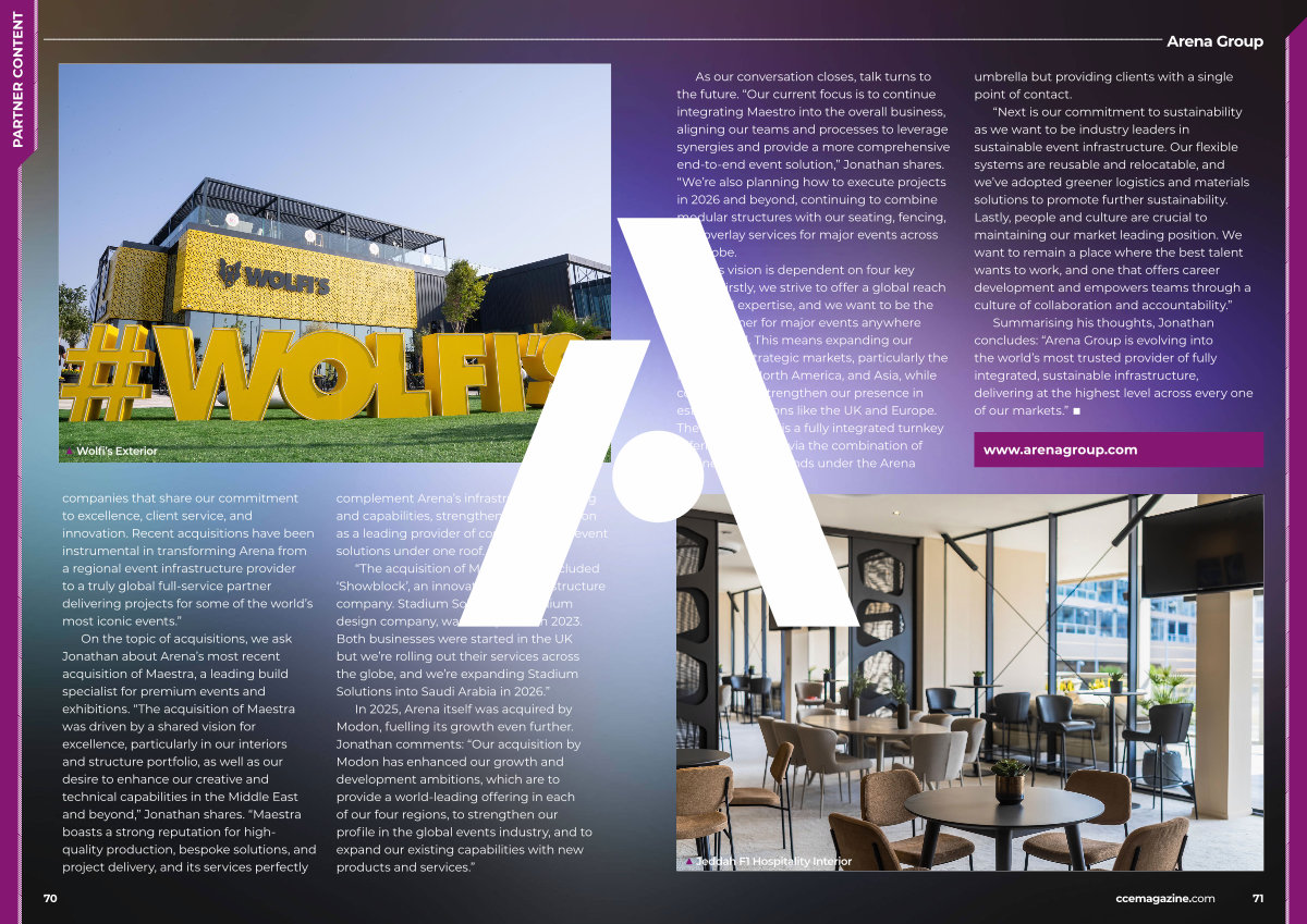 On the topic of acquisitions, we ask Jonathan about Arena’ s most recent acquisition of Maestra, a leading build specialist for premium events and exhibitions.“ The acquisition of Maestra was driven by a shared vision for excellence, particularly in our interiors and structure portfolio, as well as our desire to enhance our creative and technical capabilities in the Middle East and beyond,” Jonathan shares.“ Maestra boasts a strong reputation for highquality production, bespoke solutions, and project delivery, and its services perfectly complement Arena’ s infrastructure offering and capabilities, strengthening our position as a leading provider of comprehensive event solutions under one roof.