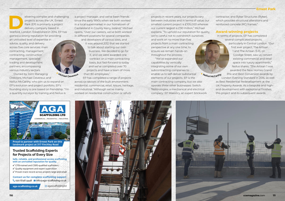 ▲ Michael Devereux a project manager, and we’ ve been friends since the early 1990s when we both worked in a local supermarket in our hometown of Castleisland in County Kerry, Ireland,” Michael opens.“ Over our careers, we’ ve both worked in different positions for several companies and developers of various sizes, and it was around 2012 that we started to talk about starting our own business. We decided to go for it, and we were awarded one contract on a main contracting basis, but fast-forward to today and we’ ve completed over 70 projects and have a team of more than 80 employees.” EP has completed a range of projects across six sectors of the built environment: residential, commercial, retail, leisure, heritage, and industrial.“ Although we’ ve mainly worked on residential construction or refurb
