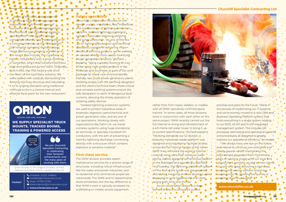 Churchill’ s LPE division focuses on the design, supply, installation, test, inspection, and maintenance of lightning protection systems, isolated lightning protection systems, specialist electrical earthing, and surge protection.“ As one of the few‘ go to’ lightning protection and earthing specialists capable of delivering major electrical earthing projects, we’ ve worked on several energy-from-waste new build power generation projects,” Richard explains.“ We’ re currently working on two of the latest high-profile projects in the Midlands and Southeast as part of the civils package for these vital environmentally friendly, new build power generation plants. Working closely with the earthing designers and the client’ s technical team, these critical and complex earthing systems ensure the safe dissipation to earth of dangerous fault currents, allowing the timely operation of isolating safety devices.