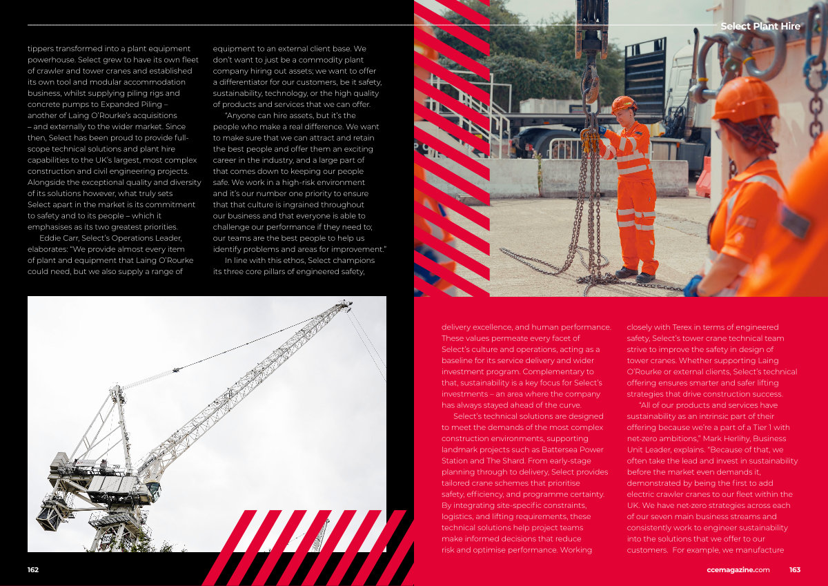 Plant Hire delivery excellence, and human performance. These values permeate every facet of Select’ s culture and operations, acting as a baseline for its service delivery and wider investment program. Complementary to that, sustainability is a key focus for Select’ s investments – an area where the company has always stayed ahead of the curve.