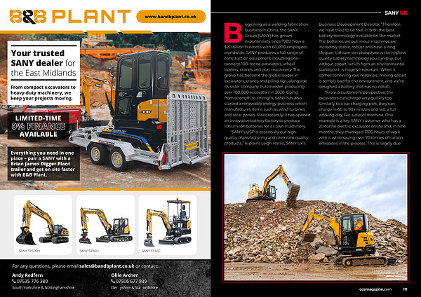 Beginning as a welding fabrication business in China, the SANY Group( SANY) has grown exponentially since 1989. Now a $ 20 billion business with 60,000 employees worldwide, SANY produces a full range of construction equipment including onetonne to 100-tonne excavators, wheel loaders, cranes and port machinery. The group has become the global leader in excavators, cranes and piling rigs, alongside its sister company Putzmeister, producing over 100,000 excavators in 2020. Going from strength to strength, SANY has also started a renewable energy business which manufactures items such as wind turbines and solar panels. More recently, it has opened an innovative battery factory to produce lithium-ion batteries for its own machinery.“ SANY’ s USP is essentially our highquality manufacturing and premium quality products,” explains Leigh Harris, SANY UK’ s