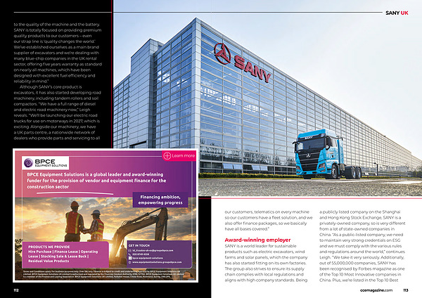 Although SANY’ s core product is excavators, it has also started developing road machinery, including tandem rollers and soil compactors.“ We have a full range of diesel and electric road machinery now,” Leigh reveals.“ We’ ll be launching our electric road trucks for use on motorways in 2027, which is exciting. Alongside our machinery, we have a UK parts centre, a nationwide network of dealers who provide parts and servicing to all