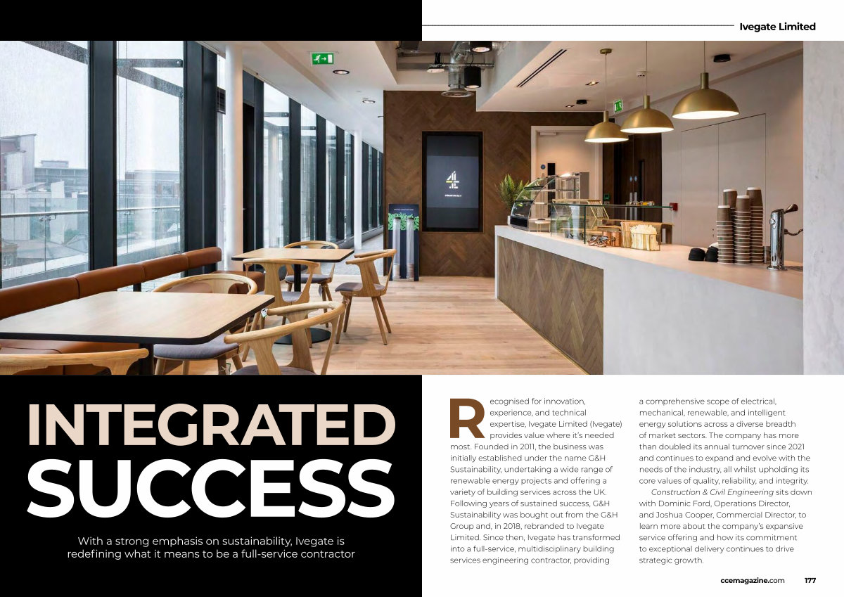 Recognised for innovation, experience, and technical expertise, Ivegate Limited( Ivegate) provides value where it’ s needed most. Founded in 2011, the business was initially established under the name G & H Sustainability, undertaking a wide range of renewable energy projects and offering a variety of building services across the UK. Following years of sustained success, G & H Sustainability was bought out from the G & H Group and, in 2018, rebranded to Ivegate Limited. Since then, Ivegate has transformed into a full-service, multidisciplinary building services engineering contractor, providing a comprehensive scope of electrical, mechanical, renewable, and intelligent energy solutions across a diverse breadth of market sectors. The company has more than doubled its annual turnover since 2021 and continues to expand and evolve with the needs of the industry, all whilst upholding its core values of quality, reliability, and integrity.