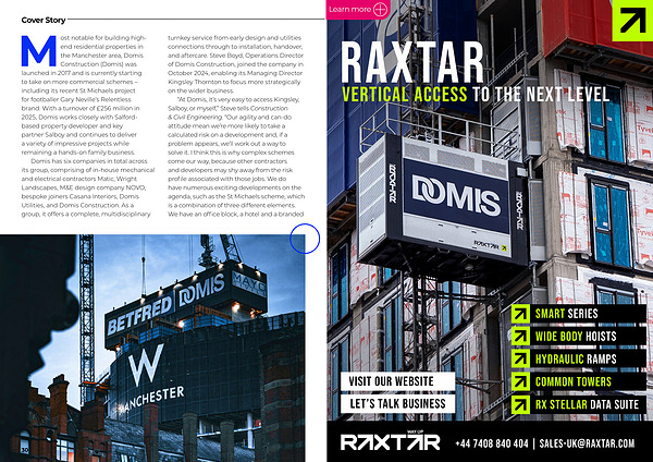 Most notable for building highend residential properties in the Manchester area, Domis Construction( Domis) was launched in 2017 and is currently starting to take on more commercial schemes – including its recent St Michaels project for footballer Gary Neville’ s Relentless brand. With a turnover of £ 256 million in 2025, Domis works closely with Salfordbased property developer and key partner Salboy and continues to deliver a variety of impressive projects while remaining a hands-on family business.