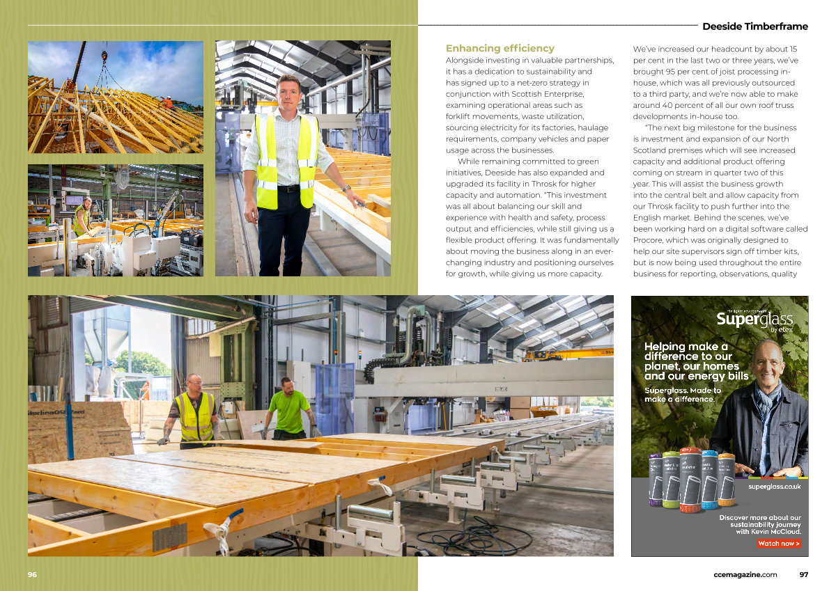 “ The next big milestone for the business is investment and expansion of our North Scotland premises which will see increased capacity and additional product offering coming on stream in quarter two of this year. This will assist the business growth into the central belt and allow capacity from our Throsk facility to push further into the English market. Behind the scenes, we’ ve been working hard on a digital software called Procore, which was originally designed to help our site supervisors sign off timber kits, but is now being used throughout the entire business for reporting, observations, quality ccemagazine. com 97