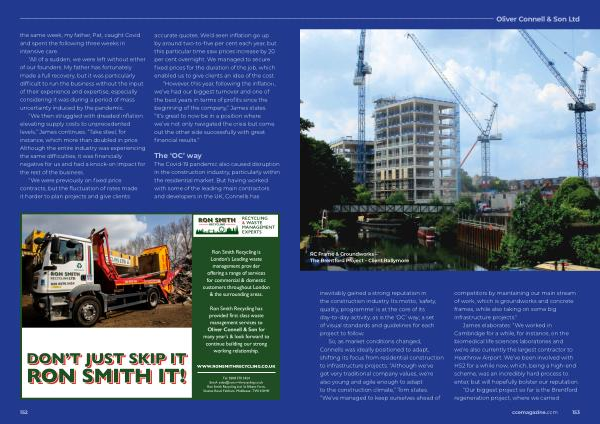 So , as market conditions changed , Connells was ideally positioned to adapt , shifting its focus from residential construction to infrastructure projects . “ Although we ’ ve got very traditional company values , we ’ re also young and agile enough to adapt to the construction climate ,” Tom states . “ We ’ ve managed to keep ourselves ahead of competitors by maintaining our main stream of work , which is groundworks and concrete frames , while also taking on some big infrastructure projects .”