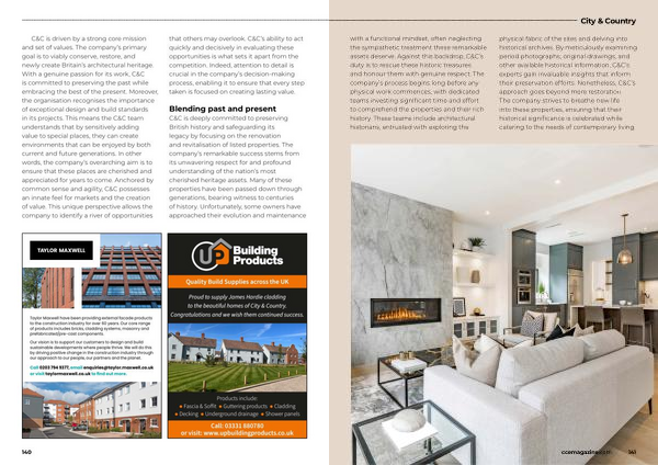 & Country with a functional mindset , often neglecting the sympathetic treatment these remarkable assets deserve . Against this backdrop , C & C ’ s duty is to rescue these historic treasures and honour them with genuine respect . The company ’ s process begins long before any physical work commences , with dedicated teams investing significant time and effort to comprehend the properties and their rich history . These teams include architectural historians , entrusted with exploring the physical fabric of the sites and delving into historical archives . By meticulously examining period photographs , original drawings , and other available historical information , C & C ’ s experts gain invaluable insights that inform their preservation efforts . Nonetheless , C & C ’ s approach goes beyond mere restoration . The company strives to breathe new life into these properties , ensuring that their historical significance is celebrated while catering to the needs of contemporary living .