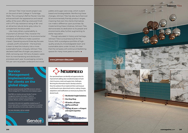 Like many others , sustainability is important at Johnson Tiles , however the company is fully proactive in its environmental initiatives and efforts to make a positive impact . Operating around three key focuses – people , profit and planet – the business is keen to lead the industry into a more sustainable future . Uniquely , Johnson Tiles declared itself free of single-use plastics in 2020 , removing over 100 tons of plastic waste from its merchandising and distribution processes each year . Its packaging contains 100 per cent recyclable cardboard and wood pallets and sugar cane wrap , which is plant based and biodegradable . Reinforcing these changes , Johnson Tiles has also launched over 50 environmentally friendly product ranges , meaning that even the clients themselves can make a difference upon purchase . By implementing these initiatives , Johnson Tiles demonstrates its dedication to its people and environments alike , further augmenting its stellar reputation .