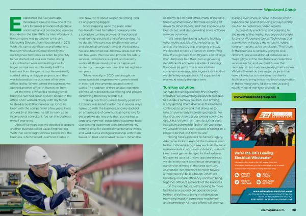 Established over 30 years ago , Woodward Group is now one of the UK ’ s foremost providers of electrical and mechanical contracting services . Founded in the late 1980s by Alan Woodward , the company was passed on to his son , Managing Director Aden Woodward , in 2015 . With this came significant transformations that saw Woodward Group diversify into exciting new territories , as Aden begins : “ My father started out as a sole trader , doing subcontracted work on building sites for larger companies , and he really built the business from the ground up . He eventually started taking on bigger projects , and that was followed by the purchase of his own office facility . When I joined the business , we opened another office , in Burton on Trent .
