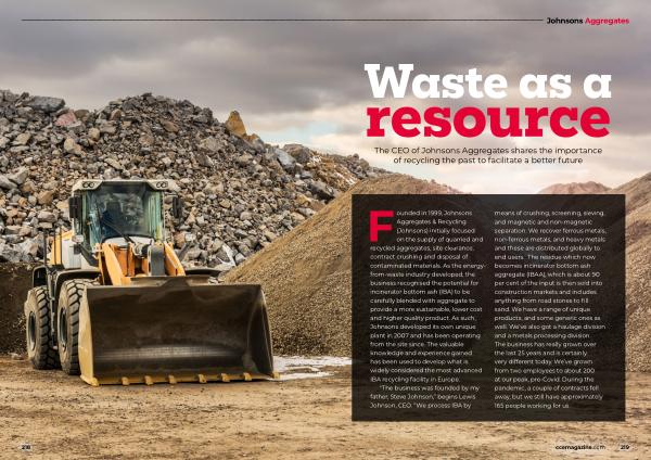 “ The business was founded by my father , Steve Johnson ,” begins Lewis Johnson , CEO . “ We process IBA by means of crushing , screening , sieving , and magnetic and non-magnetic separation . We recover ferrous metals , non-ferrous metals , and heavy metals and these are distributed globally to end users . The residue which now becomes incinerator bottom ash aggregate ( IBAA ), which is about 90 per cent of the input is then sold into construction markets and includes anything from road stones to fill sand . We have a range of unique products , and some generic ones as well . We ’ ve also got a haulage division and a metals processing division . The business has really grown over the last 25 years and is certainly very different today . We ’ ve grown from two employees to about 200 at our peak , pre-Covid . During the pandemic , a couple of contracts fell away , but we still have approximately 165 people working for us .