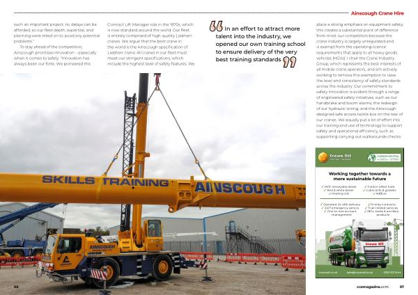 In an effort to attract more talent into the industry , we opened our own training school to ensure delivery of the very best training standards place a strong emphasis on equipment safety ; this creates a substantial point of difference from most our competitors because the crane industry is largely unregulated and is exempt from the operating licence requirements that apply to all heavy goods vehicles ( HGVs ). I chair the Crane Industry Group , which represents the best interests of all mobile crane operators , and am actively working to remove this exemption to raise the level and consistency of safety standards across the industry . Our commitment to safety innovation is evident through a range of engineered safety initiatives , such as our handbrake and boom alarms , the redesign of our hydraulic wiring , and the Ainscough designed safe access tackle box on the rear of our cranes . We equally put a lot of effort into our training and use of technology to support safety and operational efficiency , such as supporting carrying out walkarounds checks