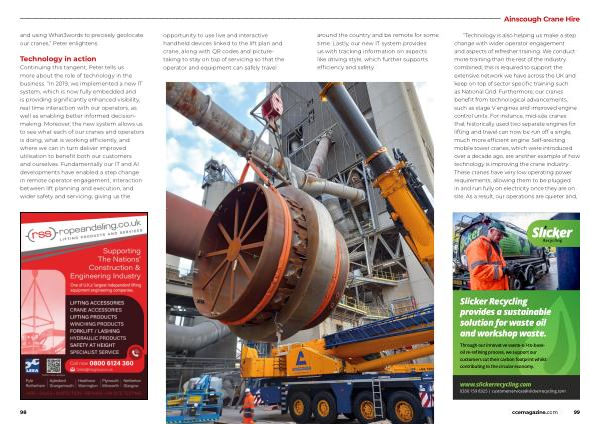 “ Technology is also helping us make a step change with wider operator engagement and aspects of refresher training . We conduct more training than the rest of the industry combined ; this is required to support the extensive network we have across the UK and keep on top of sector specific training such as National Grid . Furthermore , our cranes benefit from technological advancements , such as stage V engines and improved engine control units . For instance , mid-size cranes that historically used two separate engines for lifting and travel can now be run off a single , much more efficient engine . Self-erecting mobile tower cranes , which were introduced over a decade ago , are another example of how technology is improving the crane industry . These cranes have very low operating power requirements , allowing them to be plugged in and run fully on electricity once they are on site . As a result , our operations are quieter and ,