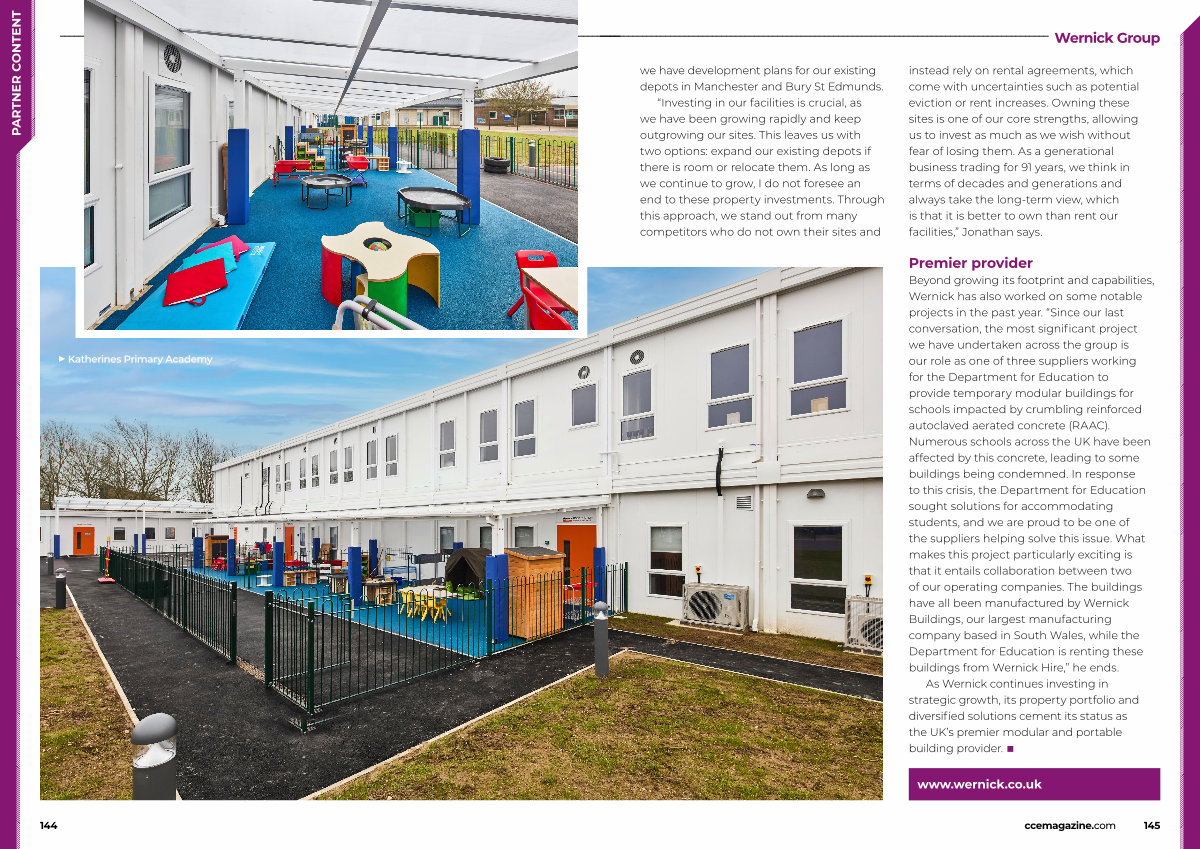Beyond growing its footprint and capabilities, Wernick has also worked on some notable projects in the past year.“ Since our last conversation, the most significant project we have undertaken across the group is our role as one of three suppliers working for the Department for Education to provide temporary modular buildings for schools impacted by crumbling reinforced autoclaved aerated concrete( RAAC). Numerous schools across the UK have been affected by this concrete, leading to some buildings being condemned. In response to this crisis, the Department for Education sought solutions for accommodating students, and we are proud to be one of the suppliers helping solve this issue. What makes this project particularly exciting is that it entails collaboration between two of our operating companies. The buildings have all been manufactured by Wernick Buildings, our largest manufacturing company based in South Wales, while the Department for Education is renting these buildings from Wernick Hire,” he ends.