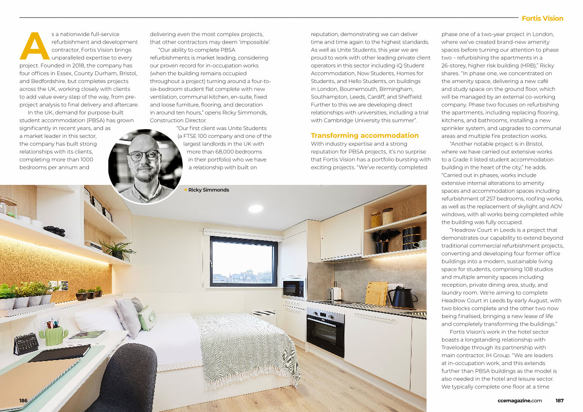 “ Our ability to complete PBSA refurbishments is market leading, considering our proven record for in-occupation works( when the building remains occupied throughout a project) turning around a four-tosix-bedroom student flat complete with new ventilation, communal kitchen, en-suite, fixed and loose furniture, flooring, and decoration in around ten hours,” opens Ricky Simmonds, Construction Director.“ Our first client was Unite Students( a FTSE 100 company and one of the largest landlords in the UK with more than 68,000 bedrooms in their portfolio) who we have a relationship with built on