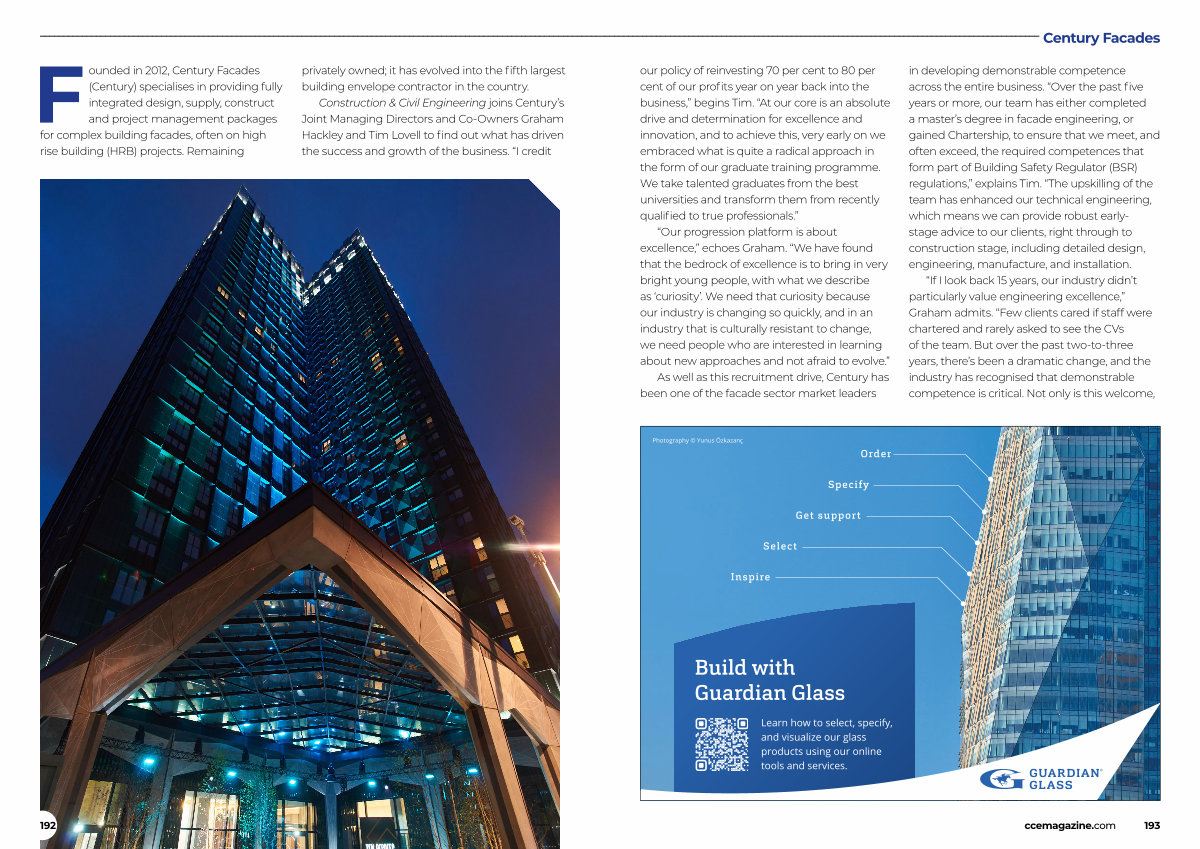 As well as this recruitment drive, Century has been one of the facade sector market leaders in developing demonstrable competence across the entire business.“ Over the past five years or more, our team has either completed a master’ s degree in facade engineering, or gained Chartership, to ensure that we meet, and often exceed, the required competences that form part of Building Safety Regulator( BSR) regulations,” explains Tim.“ The upskilling of the team has enhanced our technical engineering, which means we can provide robust earlystage advice to our clients, right through to construction stage, including detailed design, engineering, manufacture, and installation.